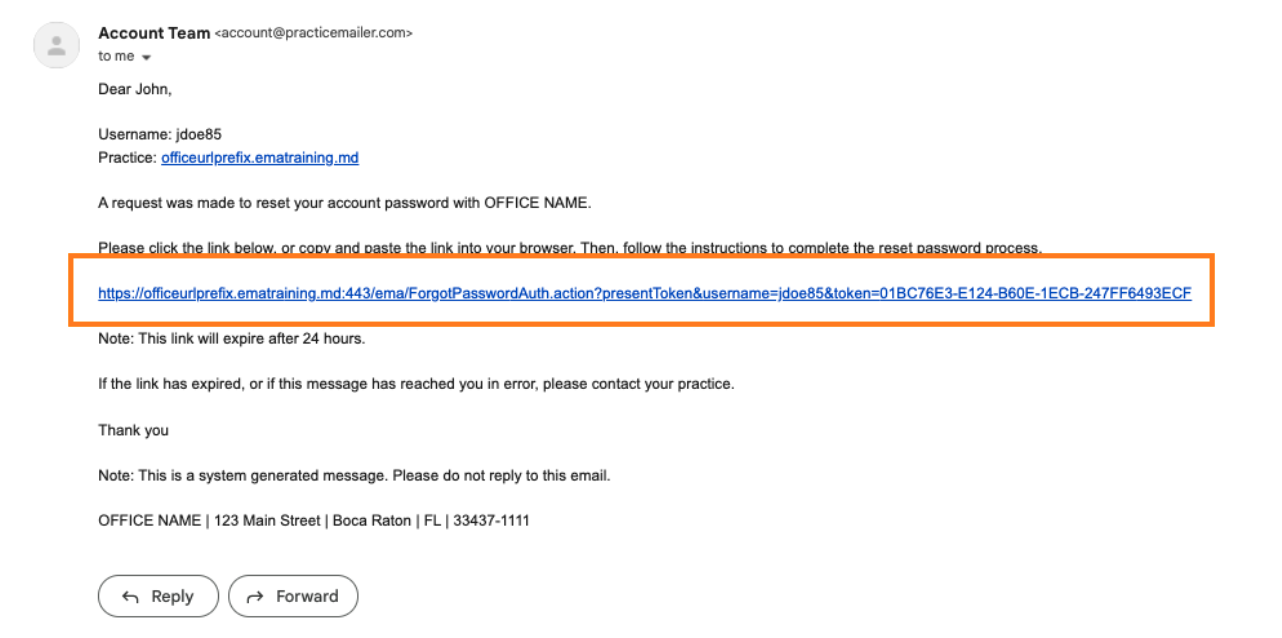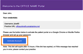 - The email will include your Patient Portal Username, Practice URL (https://u-s.ema.md/ema) and the steps for logging into the portal.